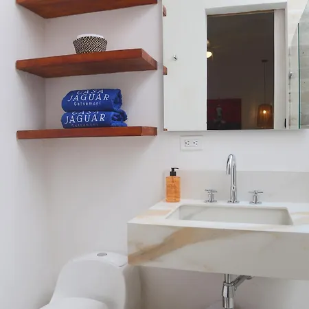 Los cuartos del hotel Casa Jaguar Hotel Boutique Cartagena están equipados con un patio, TV de pantalla plana con canales vía satélite y climatizador. Los baños disponen de una ducha a ras de suelo y un inodoro separado, además de instalaciones como secador de pelo y toallas de baño. Los huéspedes también pueden disfrutar de vistas a la piscina.